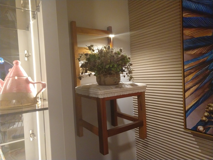 A criadora Lúcia Helena Magalhães fotografada na cafeteria da Casa Cor Sergipe 2024, no dia da abertura da mostra ao público. Ao lado, uma das atrações do espaço: uma cadeira criada pelo renomado artesão Mestre Jasson.